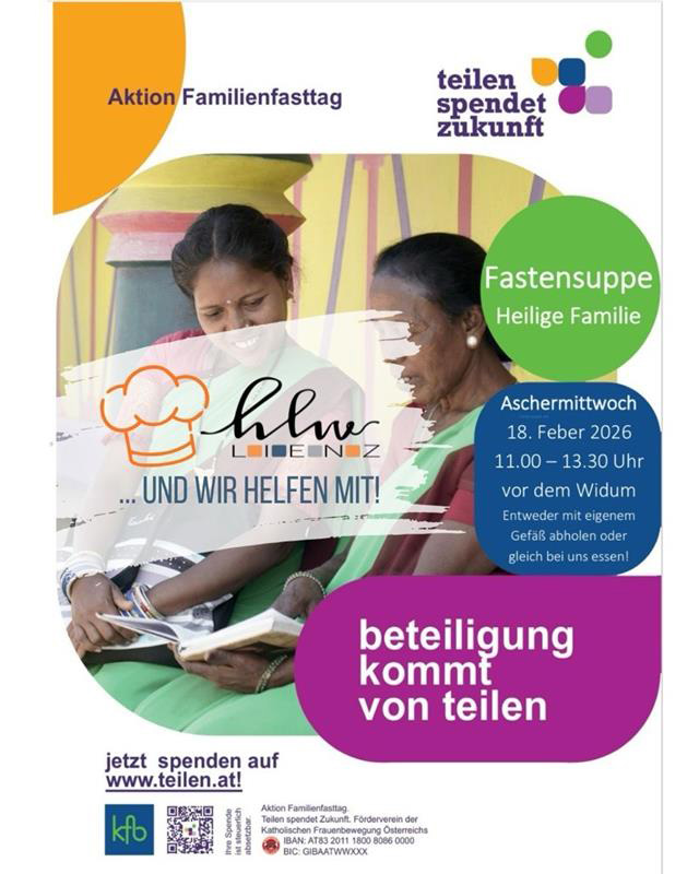 Die Fastensuppe für die Aktion „Familienfassttag“, welche mit dem Aschermittwoch startet, wurde heuer für die Pfarre der Hl. Familie von den engagierten Schülerinnen der HLW Lienz mit viel Herz zubereitet – eine schöne Gelegenheit, Gutes zu tun und gemeinsam Solidarität zu zeigen. Insgesamt wurden drei verschiedene Suppen gekocht.