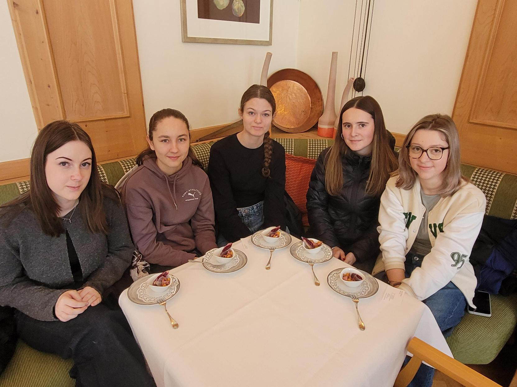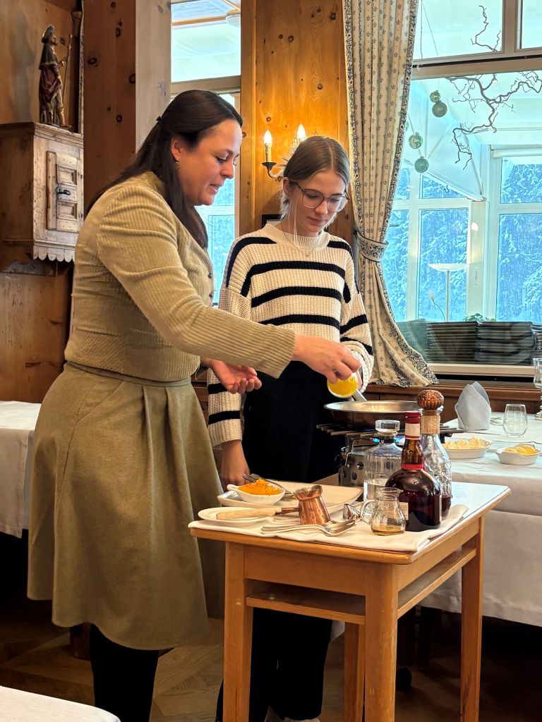 Zum krönenden Abschluss durften die Schüler:innen noch kulinarische Spezialitäten genießen: Neben Kuchen gab es eine wärmende Suppe und Garnelen-Samosas als Stärkung. Die Gastgeberin Marie Theres zeigte außerdem, wie sie den bekannten „Signature Dish“ des Parkhotels – nämlich die beliebten Crêpe Suzette – für die Gäste zubereitete.